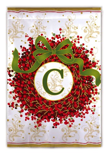 Holiday Christmas Red and Green Berry Wreath Monogram "C" Flag 12.5" x 18"