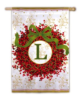 Holiday Christmas Red and Green Berry Wreath Monogram "L" Flag 29" x 43"
