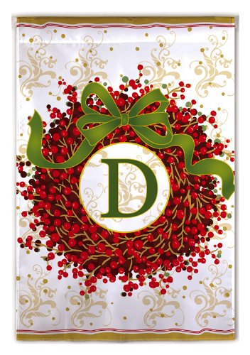Holiday Christmas Red and Green Berry Wreath Monogram "D" Flag 12.5" x 18"