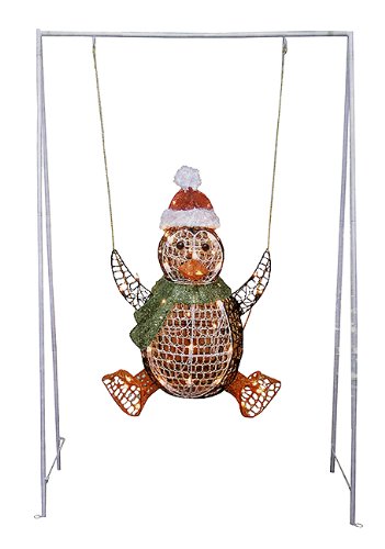 Features an impressive, dazzling swirled metal mesh design that is embellished with loads of sparkling glitterPenguin hangs from a white metal swing pole, he will rock back and forth with the wind or with a lil' pushAdditional product features:Easy assembly, no tools requiredCollapsible construction for easy storageLawn stakes includedUL listed for indoor/outdoor use120 volts, 60 Hz, 0.17 amps, 20.