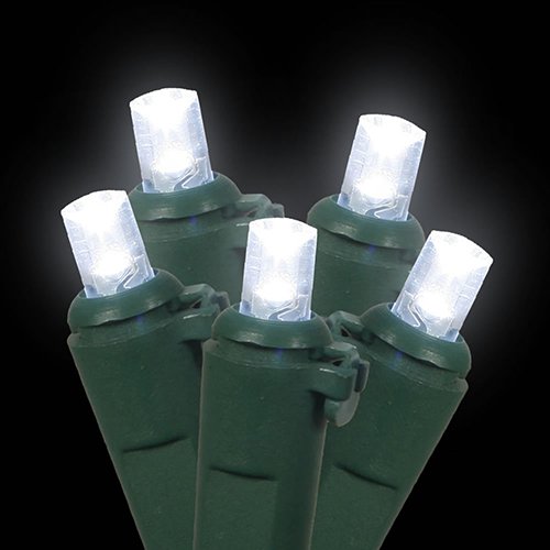 Product Features:Color: cool white bulbs / green wire"Cool white" also known as "polar white" has a very slight blue tint, with the look of ice and is used to create a true wintry scene Number of bulbs on string: 100Bulb size: concave wide angleSpacing between each bulb: 4"Lighted length: 32.4'Total length: 33.2'5" lead cord4" tail cord