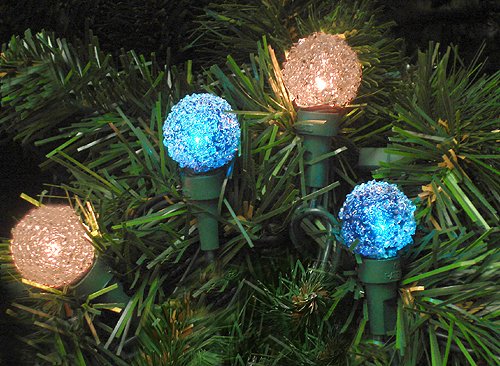 Set of 35 Blue and Clear Sugared Globe Christmas LightsFrom the Specialty Series Collection by Everstar, Item #ES72-262Product Features:Steady burning or single flashingUL listed for indoor and outdoor use120V, 60HzString-to-string allows you to connect multiple sets together Color: Clear Bulbs in Blue and Clear Sugared Globes / Green WireNumber of Bulbs on each string: 35Bulb Size: Mini-Bulb with a G23 globe coverSpacing Between Each Bulb: 4"Lighted length: 14'(4.2m) Total String Length: 16.