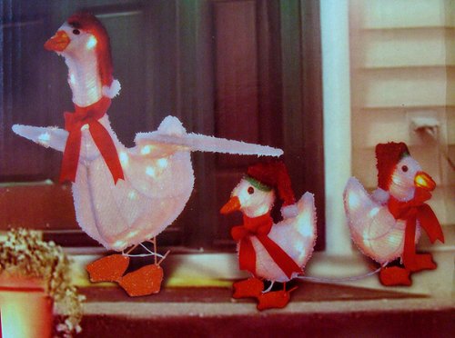 Features:Pre-lit with 50 clear lights Bulb size: miniSpacing between each Goose: 16 inches (approx)4.9 foot white lead cordContains 1 plug with end connector, allowing you to stack multiple lighted decorations together (not to exceed 210 watts) 3-Piece Lighted Goose Family SetItem #53-245-066Dimensions:Large: 28"H X 25"W X 20"D (wing tip to wing tip)Small: 10"H X 5"W X 10"D (wing tip to wing tip)Material(s): fabric/tinsel/glass bulbs/wire Additional product features:Geese are all connected on one strand, they can not be separatedSome minor assembly required Lawn stakes includedUL listed for indoor/outdoor use120 volts, 60 hertz, 0.17 amps, 20.
