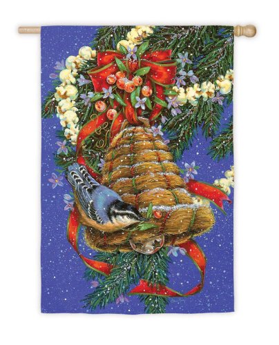 Flag depicts a blue bird and jingle bell shaped nest wrapped in popcorn garland Dimensions: 18"H x 12.5"W x 0.