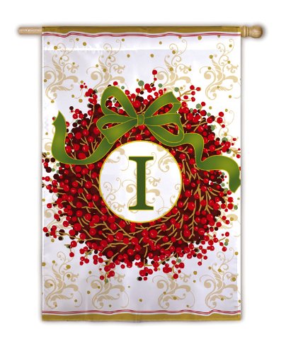 Holiday Christmas Red and Green Berry Wreath Monogram "I" Flag 29" x 43"