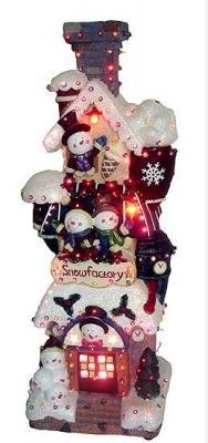 UL ListedAC Adaptor and 2 spare Halogen bulbs included120V AC 60HzMeasurements: 32.5"H x 11"W x 9"DMaterial: Resin Fiber Optic Snowman Factory Candy House Christmas DecorationFrom Sterling Inc. Item #518030This colorful decoration is sure to add some excitement to your holiday decor. It features lots of little Snowmen ready and waiting to greet you on your way into the Candy House.If the array of brightly colored lights from the fiber optic is not enough, the building is embellished with iridescent glitter, adding more sparkle and shine to this exquisite decoration.