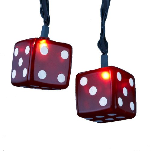 Dimensions of each light cover: 2" squareMaterial(s): plastic light covers/glass bulbs/wire Features:Red casino dice light coversColor: clear bulbs / green wireNumber of bulbs on string: 10Bulb size: miniatureSpacing between each light: 12 inchesLighted length: 9 feet (2.74m)Total length: 11.5 feet (3.