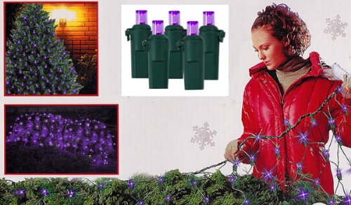 Features: Color: purple bulbs / green wire Bulb size: wide angle (concave mini bulb) Number of bulbs on string: 120 Dimensions: 4 feet x 6 feet Total lighted area: 24 square feet 24" lead cord
